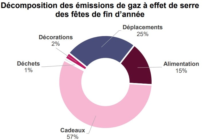 La quasi-totalité de ces émissions provient de trois postes (par ordre d'importance) : les cadeaux, les déplacements et l'alimentation. Les cadeaux (57% de l'impact carbone durant les fêtes) sont en particulier « à l’origine de 3 575 kilotonnes de CO2 équivalent à l’échelle de la population française, soit 122 kg par ménage et 53 kg par personne en moyenne », précise l'Ademe.
