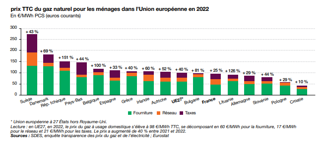 La hausse aurait dû être plus forte, mais elle a été réduite grâce à la mise en place d'un bouclier tarifaire. Cette intervention de l'État français a permis de contenir la hausse, faisant passer la France dans la moyenne basse des prix du gaz en Europe. En 2022, le prix du gaz dans l'UE avait augmenté de 40% en moyenne pour les ménages, pour s'établir à 98 €/MWh PCS.