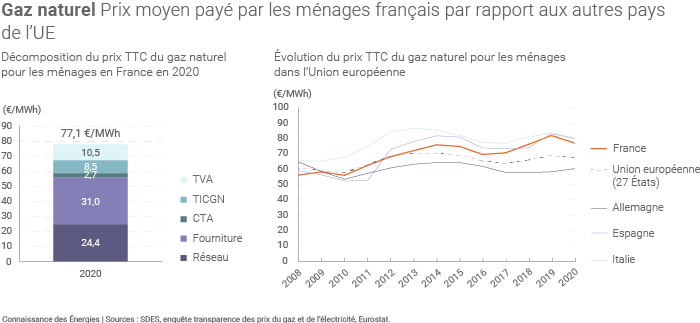 En 2022, le prix moyen du gaz naturel facturé aux ménages français s'est élevé, toutes taxes comprises, à 96 €/MWh PCS (pouvoir calorifique supérieur(2)), selon le Service des données et études statistiques (SDES) du ministère de la Transition écologique(3). C'est 25% de plus qu'en 2021 (et qu'en 2020, les prix ayant stagné entre ces des années).