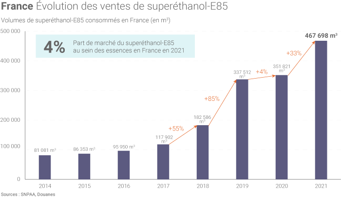 En 2024, la consommation de superéthanol E85 s'est élevée à 887 millions de litres, soit une multiplication par 2,6 du volume consommé en 2021 (338 millions de litres).