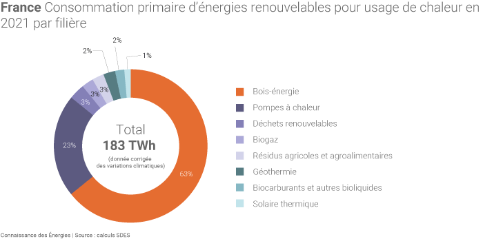 Le bois énergie occupe actuellement une place centrale au sein de la chaleur renouvelable (63% de la consommation primaire d’énergies renouvelables pour usage de chaleur corrigée des variations climatiques en 2021), devant les pompes à chaleur (23%) et loin devant les autres filières (gaz renouvelables, géothermie, etc.). Parmi ces dernières, la solaire thermique a fourni 1,27 TWh de chaleur renouvelable en France en 2021 (à l'origine de 0,8% de la chaleur renouvelable et donc de près de 0,2% de la chaleur consommée en France en 2021).