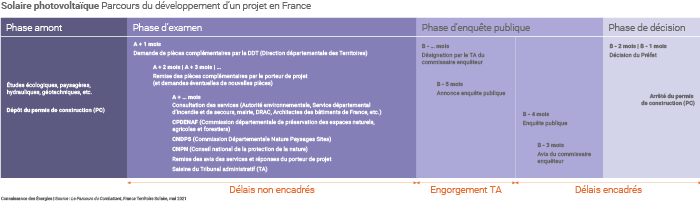 Il est rappelé qu’en France, « la variable d’ajustement la plus importante reste les volets urbanisme et environnement tandis dans les autres pays européens la majeure partie du processus de développement du projet est consacrée aux enjeux d’acquisition de terrains et d’obtention de l’accès au réseau électrique ».