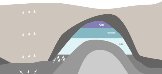 Ayant une faible densité par rapport à l’eau des couches rocheuses environnantes, l’hydrocarbure expulsé remonte vers la surface depuis des zones de grandes pressions vers d’autres zones de plus faibles pressions : on parle alors de « migration secondaire ». Durant sa remontée, l’hydrocarbure peut rencontrer un piège (faille, pli, anticlinal, etc.) sur son parcours : il est dans ce cas bloqué et stocké dans une roche-réservoir, elle-même surplombée par une roche-couverture imperméable (argile par exemple). La roche-réservoir étant poreuse et perméable, cette zone est propice à l’exploitation « conventionnelle » du pétrole et du gaz.