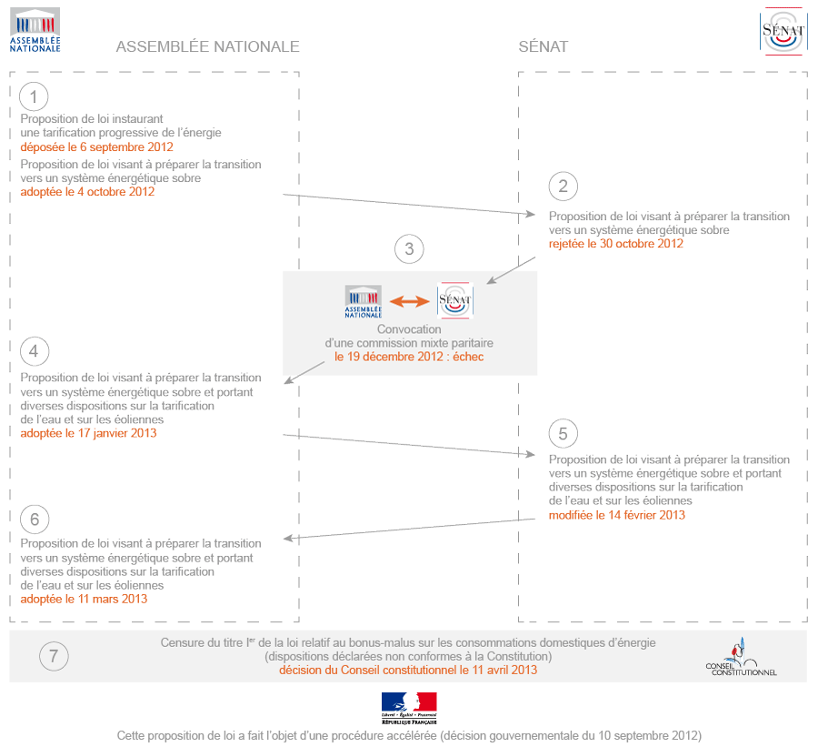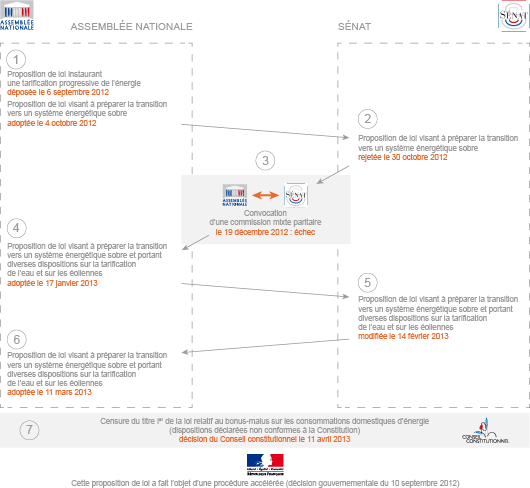 Le Conseil constitutionnel était saisi de plusieurs griefs à l’encontre de la loi adoptée par le Parlement instaurant, entre autres, une tarification progressive de l’énergie. Le 11 avril 2013, il en a censuré l’article 2 censé instituer un « bonus-malus » énergétique en raison de la « violation du principe d’égalité devant les charges publiques ».