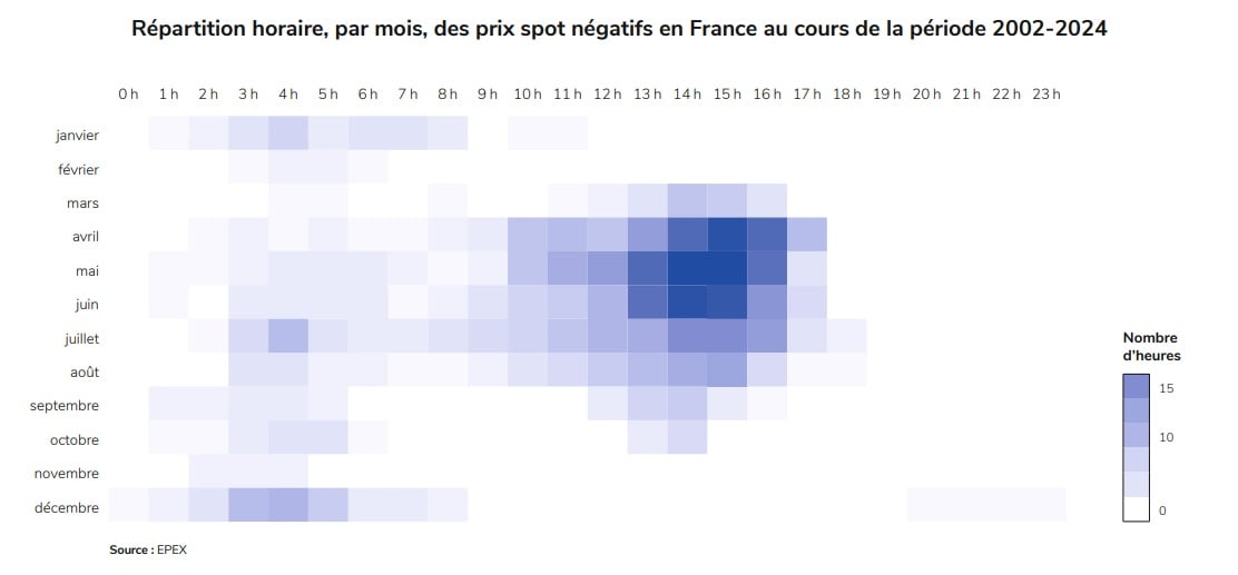 Dans son Bilan électrique 2024(2), RTE indique que « deux fois plus de prix spot négatifs qu’en 2023 ont été enregistrés en 2024 », avec 359 heures concernées, soit 4% du temps.