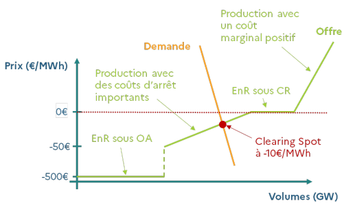 Certaines installations renouvelables, sous obligation d'achat (OA), sont « insensibles aux prix de marché et produisent à tout prix alors que leur coût d’arrêt est en général nul ou très faible », note la Commission de régulation de l'énergie (CRE) dans son rapport de novembre 2024. Elles ne pâtissent ainsi pas de ces épisodes à prix négatifs (voir schéma de la CRE ci-après qui représente l'équilibre sur le marché spot lors d'une heure à prix négatif).