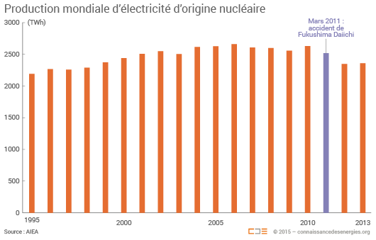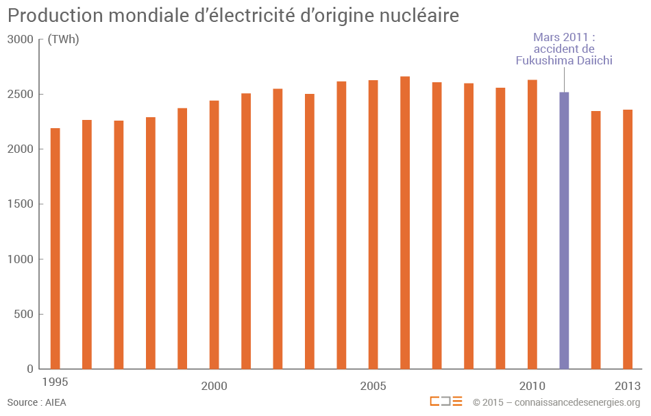 Avant Fukushima, la production nucléaire mondiale a montré une grande stabilité. L'accident de Fukushima en mars 2011 a eu pour conséquence une légère chute à 2 610,34 TWh, poursuivant une baisse plus prononcée en 2012 avec 2 432,22 TWh. Cette baisse est principalement due à l'arrêt immédiat et prolongé de nombreux réacteurs, notamment au Japon, et à des réévaluations de la sécurité nucléaire dans plusieurs pays, entraînant des fermetures temporaires ou permanentes.