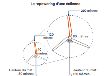 Précisons que certains acteurs distinguent les opérations de « repowering » complet et partiel (ex : remplacement des rotors d’éoliennes).