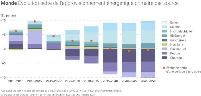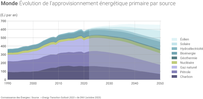 Alors que la production mondiale d'énergie pourrait atteindre un pic en 2038 selon DNV, les énergies fossiles pourraient rester majoritaires dans le mix énergétique jusqu'à la moitié du XXIe siècle. Dans ses prévisions, DNV estime que la consommation d'énergie fossile pourrait chuter de près de 35,9% entre 2022 (490 EJ, soit environ 80% du mix énergétique mondial) et 2050 (314 EJ, 48% du mix).
