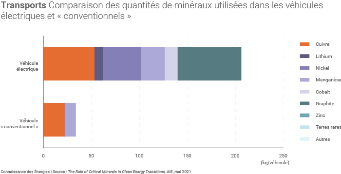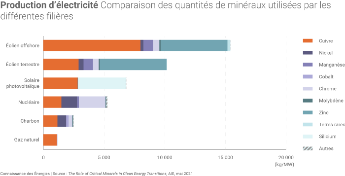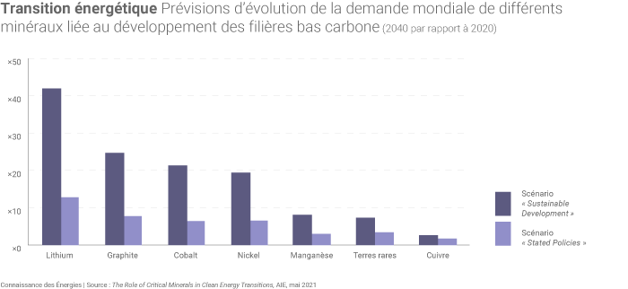 Le « passage à un système énergétique bas carbone devrait entraîner une augmentation considérable des besoins » de nombreuses ressources minérales, souligne l'AIE. Ces besoins de ressources varient selon les filières et technologies employées : lithium, nickel, cobalt, manganèse et graphite pour la constitution de batteries, terres rares pour les aimants permanents d'éoliennes et de moteurs de véhicules électriques, cuivre et aluminium pour le déploiement des réseaux électriques, etc.