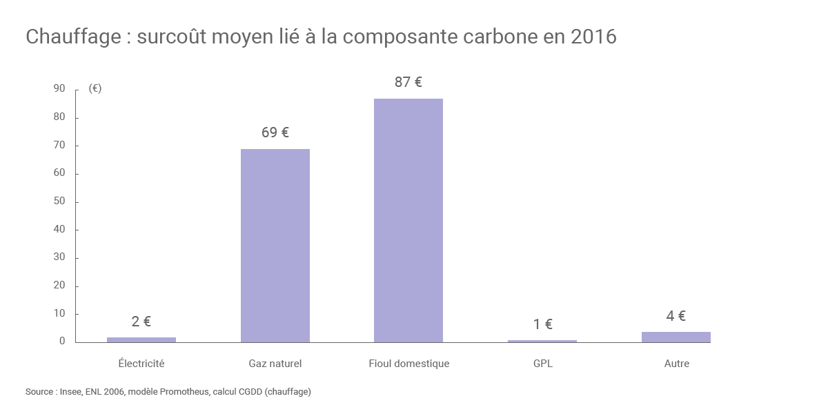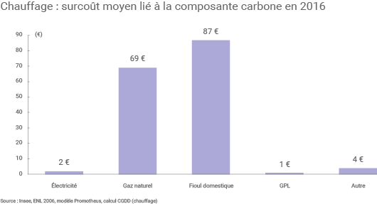 Dans une note du Commissariat général au développement durable rendue publique en 2016, le ministère en charge de l’énergie a chiffré ce surcoût lié à la composante carbone pour les consommateurs : il était alors évalué à 83 euros en moyenne par ménage en 2016 (combustibles et carburants compris). Ce montant équivalait approximativement à 3% des dépenses énergétiques par an desdits ménages.