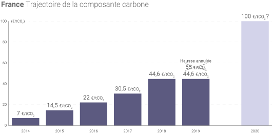 Or la composante carbone s'est trouvée au cœur du mouvement des « gilets jaunes » et sa hausse prévue en 2019 a été annulée. Le montant de la « taxe carbone » est depuis gelé à 44,6 €/t CO2.