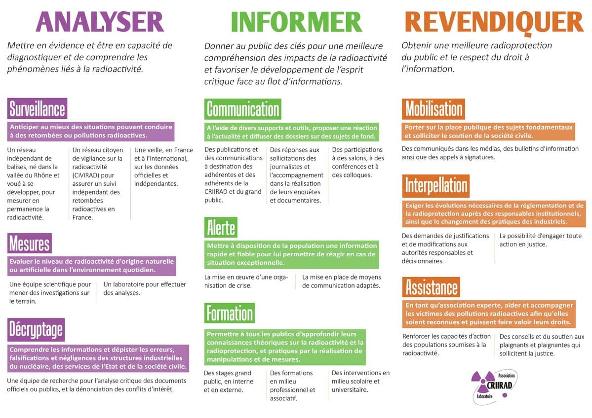 Le champ d’intervention de la CRIIRAD recouvre « entre autres, les utilisations civiles et militaires de l’énergie nucléaire, la radioactivité naturelle et artificielle, le contrôle de l’état radiologique de l’environnement ainsi que le fonctionnement et l’impact, en situation normale ou accidentelle, des installations qui fabriquent, exploitent, détiennent, stockent ou utilisent des matières radioactives ».