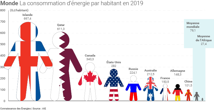 Deux pays dans le monde se distinguent tout particulièrement par leur très importante consommation d’énergie par habitant : l’Islande (697,4 GJ/habitant en 2019, soit presque 9 fois le niveau moyen dans le monde) et le Qatar (611,3 GJ/habitant en 2019). Précisons que l'Islande s'appuie toutefois en grande partie sur la géothermie pour satisfaire ses besoins énergétiques : ses émissions de CO2 par habitant sont ainsi proches de la moyenne mondiale et bien plus faibles que dans les autres pays de l'OCDE(2).