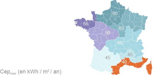 La Cepmax (en kWh/m2/an) est modulée en fonction de la localisation géographique.