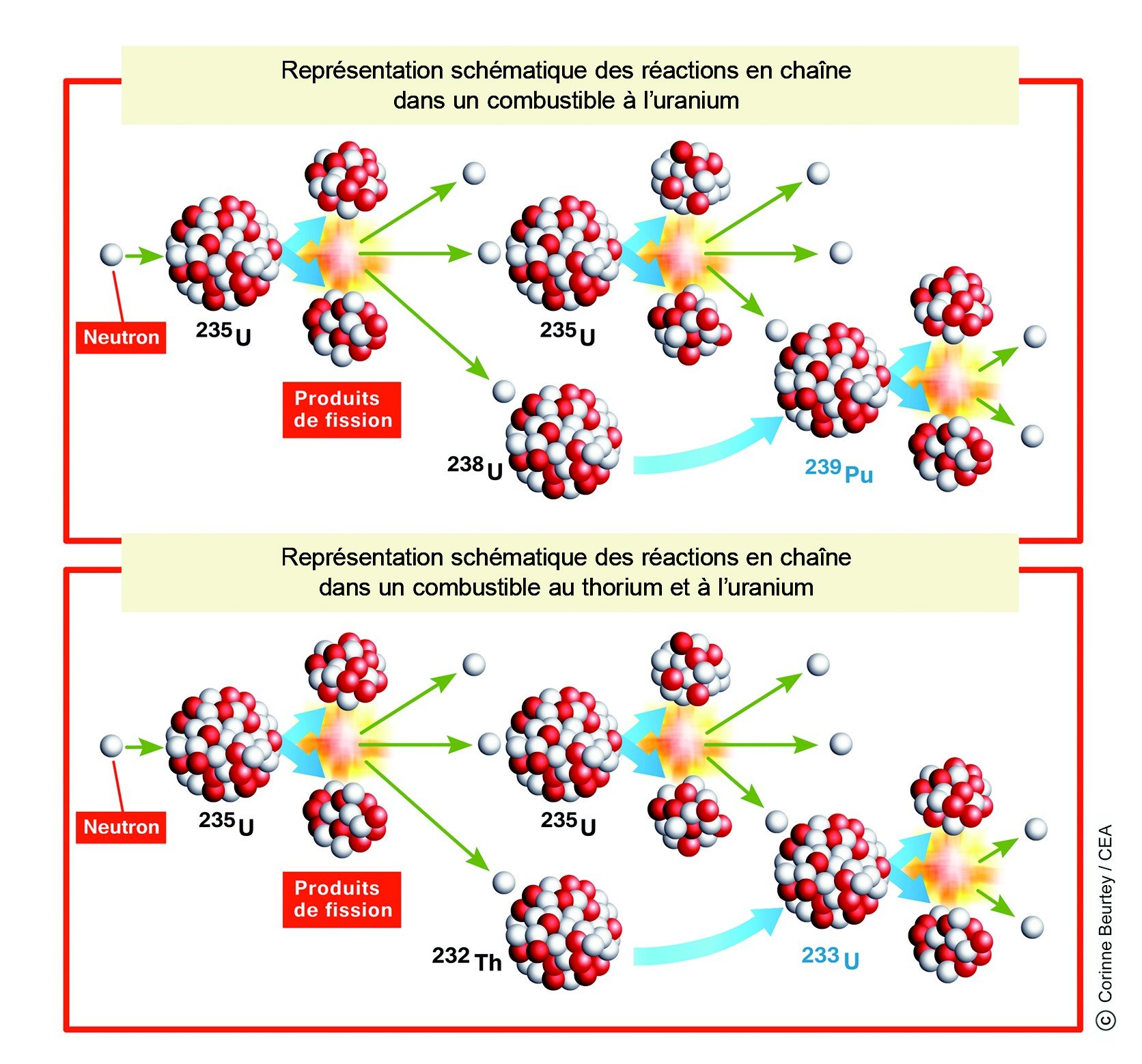 Dans le cas de l'uranium, la réaction en chaîne est donc amorcée par de l'uranium 235 présent dans le minerai naturel puis dans le combustible préparé à partir de ce minerai. Dans le cas du thorium, « il faut ajouter artificiellement un élément fissile (ici de l'uranium 235) dans le combustible préparé à partir de minerai naturel de thorium qui est non fissile », explique le CEA(2) (comme l'illustre son schéma suivant).