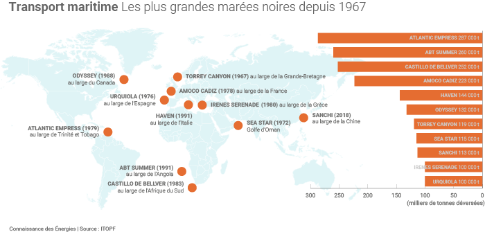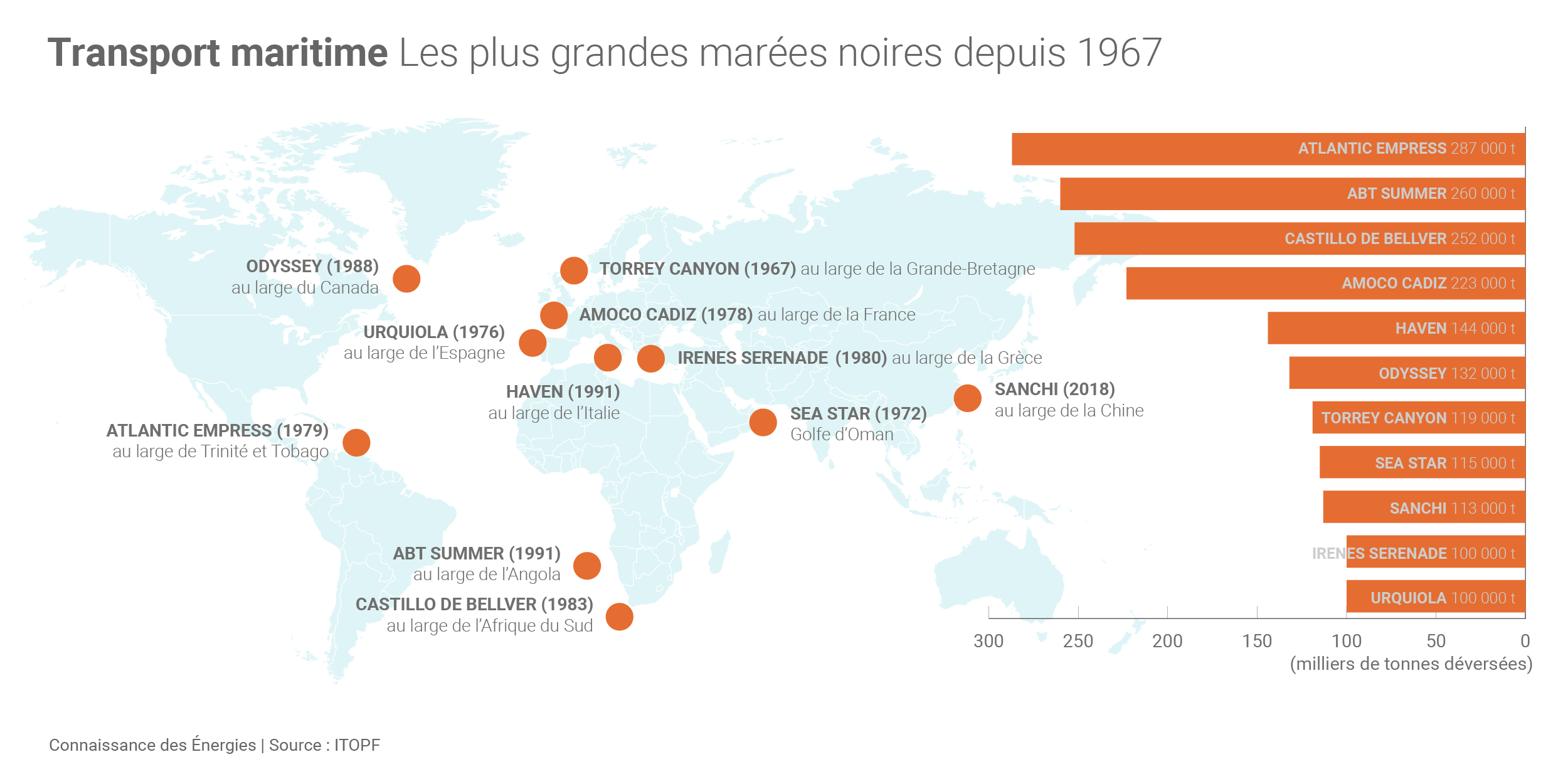 Depuis 1967, quatre marées noires liées à des naufrages de navires ont provoqué des déversements en mer de plus de 200 000 tonnes d'hydrocarbures selon l'ITOPF (par ordre d'importance) :