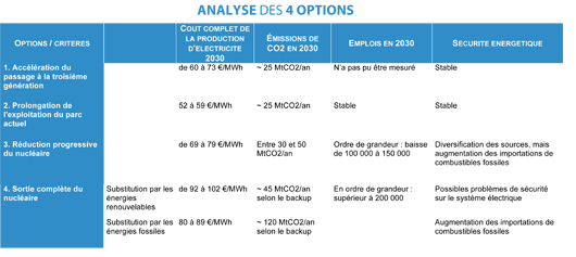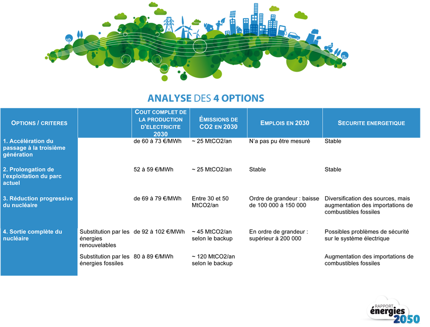 La commission Energies 2050 conclut que la prolongation du parc nucléaire au-delà de 40 ans présente le meilleur bilan au regard des coûts de production électrique, des émissions de CO2 ou encore du nombre d'emplois liés. En 2030, le coût complet de la production d’électricité en France pourrait atteindre 52 à 59 euros le MWh dans le cas d’une prolongation du parc nucléaire actuel, contre 69 à 79 euros le MWh en cas de réduction progressive de celui-ci. Pour rappel, les coûts complets de production de l’électricité (hors taxes et coûts d’acheminement) constituent 40% du prix final payé par le consommateur.