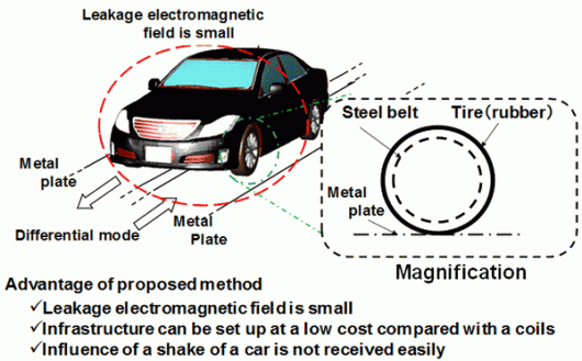 Leur réflexion s’inspire de l’alimentation des trains, par électrification de câbles en hauteur. Pour atteindre un résultat similaire sans dangerosité, les deux chercheurs veulent se servir de la route pour émettre des ondes radios. Celles-ci seraient émises par des onduleurs(1) implantés sur les chaussées et transmises par des plaques métalliques, incluses sous le revêtement des routes. Des récepteurs seraient situés dans deux roues des véhicules. Les pneus de la voiture contiendraient des ceintures en acier permettant de transmettre de l’électricité au véhicule.
