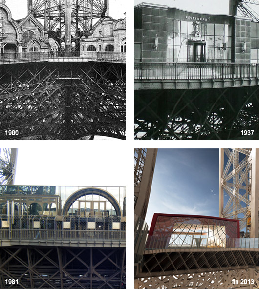 Le 1er étage connaît sa troisième grande opération de rénovation depuis 1900. Ici, images des pavillons. (©collection tour Eiffel et ©agence Moatti-Rivière pour le dernier visuel)
