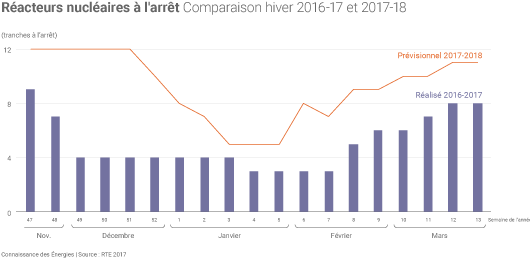 Côté production, RTE prévoit une meilleure disponibilité des centrales nucléaires par rapport à l’hiver dernier : seuls 3 à 4 réacteurs devraient être à l’arrêt cette année contre 12 en décembre 2016 et 5 durant la vague de froid de janvier 2017. Par rapport à l’an dernier, la France devrait au total disposer respectivement de 7,2 GW et 2,8 GW de moyens supplémentaires en décembre et janvier (en incluant les capacités d’effacement et d’importations).