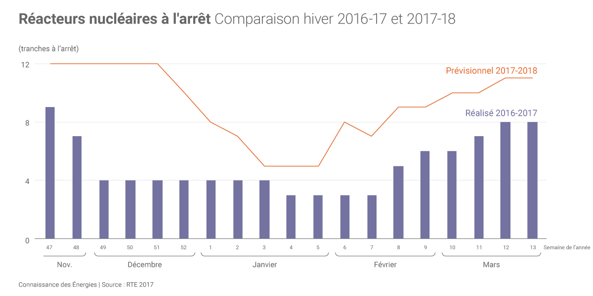 RTE prévoit une plus grande disponibilité du parc nucléaire par rapport à l'hiver dernier, sur la base des données transmises par EDF. (©Connaissance des Énergies, d’après RTE)