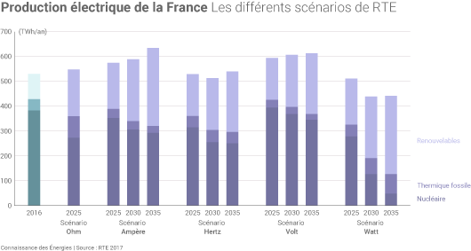 - en matière de production : une croissance forte de la production renouvelable (entre 243 TWh et 315 TWh par an en 2035 contre près de 100 TWh par an à l’heure actuelle) et des fermetures de réacteurs nucléaires (déclassement de 9 à 52 tranches);