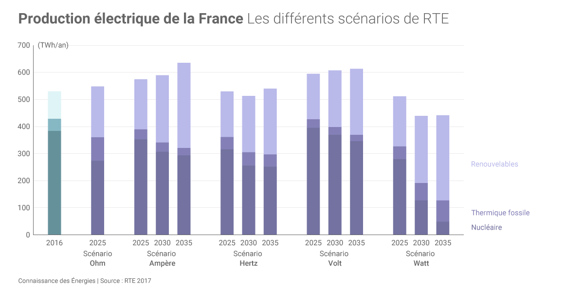Le scénario Ohm de RTE intègre l'objectif de porter à 50% la part du nucléaire dans le mix électrique français en 2025. Il est jugé incompatible avec les objectifs climatiques de la France par Nicolas Hulot. (©Connaissance des Énergies, d’après RTE)