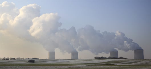 Vue en hiver des tours de refroidissement de la centrale nucléaire de Cattenom. (©EDF-David Queyrel)