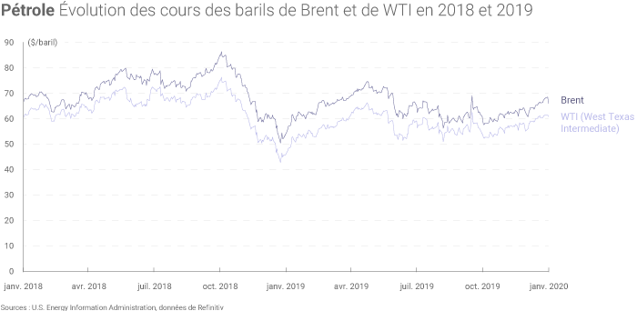 Les cours du pétrole ont augmenté début 2020, « reflétant une augmentation des risques géopolitiques » selon l’EIA américaine : le cours du baril de Brent a dépassé 70 $ le 6 janvier « en raison des risques de déstabilisation » dans le Golfe mais « les effets limités de la réaction iranienne, à savoir le tir de missiles sans victimes dans la nuit du 7 au 8 contre deux bases abritant des soldats américains en Irak, ont depuis fait reculer les prix », constate IFP Énergies nouvelles dans son tableau de bord pétrolier du 13 janvier.