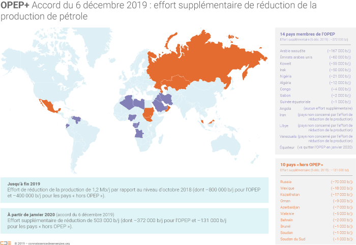 Au total, la baisse de production sur laquelle communique l’OPEP+ devrait, à partir du 1er janvier 2020, s’élever à 1,7 Mb/j (par rapport à octobre 2018). Si les différents producteurs respectent leurs quotas de production, le ministre saoudien de l'Énergie, Abdel Aziz ben Salmane, a en outre annoncé l’ambition de son pays d’apporter une « réduction volontaire additionnelle » de 400 000 b/j, ce qui porterait la baisse de réduction de l’OPEP+ à 2,1 Mb/j. L’Arabie saoudite a un intérêt particulier à soutenir les cours du pétrole dans le contexte de l’entrée de son géant national Saudi Aramco à la Bourse de Riyad le 11 décembre.