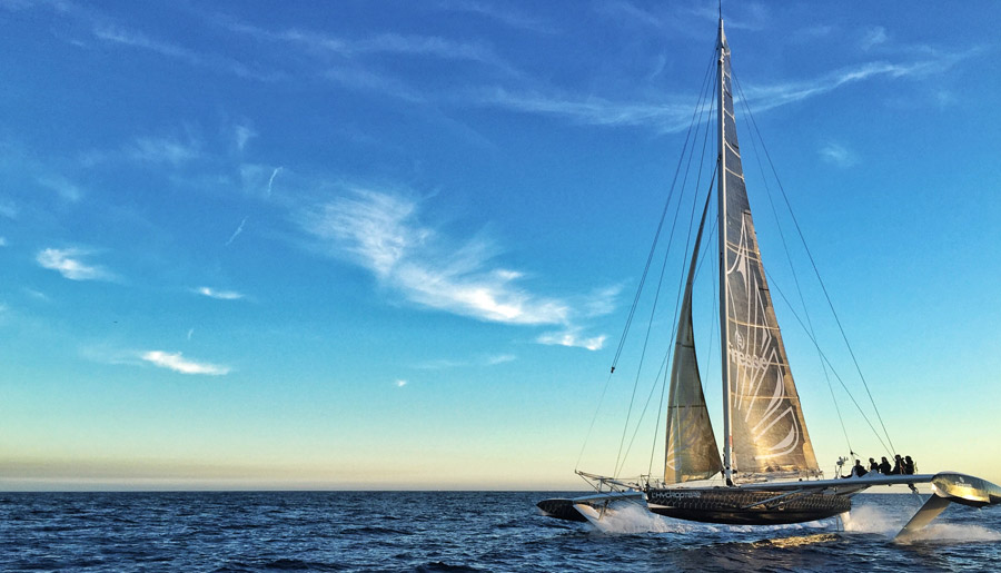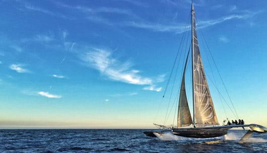 En 2009, l'Hydroptère a battu le record de vitesse à la voile sur 500 mètres et atteint une pointe de 55,5 noeuds, soit plus de 100 km/h. (©Paul Bessereau-Hydroptère)