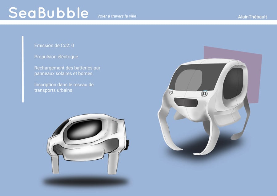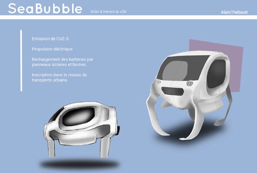C’est ainsi qu’est né le « Sea Bubble », un véhicule en forme de bulle, de taille similaire à la Zoé de Renault, capable de transporter 4 personnes (incluant le chauffeur) au-dessus de l’eau. Tout comme l’Hydroptère, « des ailes immergées développent une portance qui croit avec le carré de la vitesse et soulèvent l’engin », précise Alain Thébault, le concepteur des SeaBubbles. En revanche, ces dernières ne sont plus propulsées par des ailes comme le voilier mais par un petit moteur électrique(2).