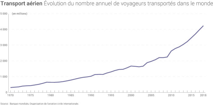 Le trafic aérien est en forte hausse (+ 6,8% par an au niveau mondial en passagers.km(4)) et les progrès techniques réalisés par les avionneurs et les motoristes « ont surtout permis le développement du trafic, par un effet rebond qu’aucune politique ne s’attache à maîtriser »(5).