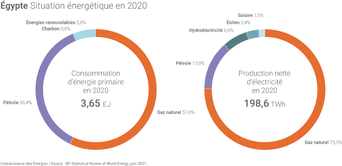 Dans cette note de synthèse en anglais publiée le 4 avril, l’EIA américaine (Energy Information Administration) présente les principaux chiffres clés relatifs à l'énergie en Égypte. Le rôle du gaz naturel y est en particulier mis en exergue : en 2020, cette énergie a compté pour 57% de la consommation d’énergie primaire dans le pays et pour 75,5% de la production nationale d'électricité.