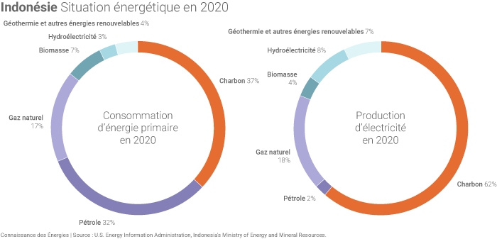 Le charbon occupe également une place centrale dans le mix énergétique de ce pays de plus de 270 millions d'habitants : en 2020, il a compté pour 37% de la consommation d'énergie primaire et pour 62% de la production d'électricité au niveau national. La consommation de charbon en Indonésie a plus que doublé entre 2010 et 2019.