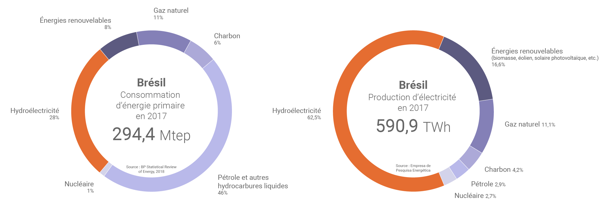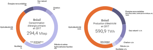 En 2017, l’hydroélectricité a compté pour 28% de la consommation d’énergie primaire du Brésil et pour 62,5% de la production électrique de ce pays. (©Connaissance des Énergies, d'après BP et EIA)