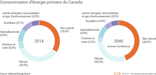 La demande d’énergie canadienne devrait poursuivre sa croissance mais à un rythme annuel moyen de seulement 0,7% entre 2014 et 2040, soit presque deux fois plus lent que sa croissance entre 1990 et 2013, prédisait alors l'Office. L’intensité énergétique de l’économie canadienne (consommation d’énergie par point de PIB) devrait parallèlement continuer à diminuer, à un rythme moyen de 1% par an entre 2013 et 2040.La hausse de la production d’énergie cumulée à une croissance limitée de la demande devrait ainsi, selon l’Office national de l’énergie, permettre au Canada d’augmenter sensiblement ses exportations, sous réserve de bénéficier de nouveaux moyens pour les acheminer (au sein de nouveaux oléoducs pour le pétrole, sous forme de GNL pour le gaz).