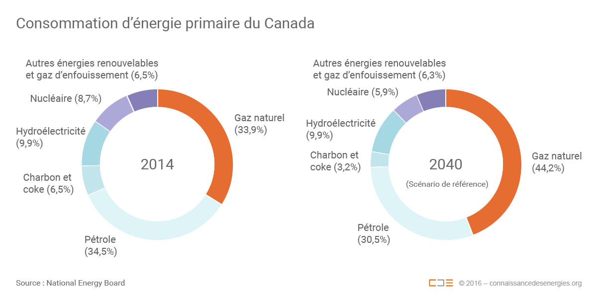 Dans son scénario de référence, l’Office national de l’énergie envisageait une croissance de la production canadienne de pétrole brut de 56% d’ici à 2040 (par rapport à 2014) qui atteindrait alors 6,1 millions de barils par jour (Mb/j) à cet horizon. La production de gaz naturel, dont l’évolution dépend en partie des capacités d’exportations sous forme de GNL, pourrait quant à elle augmenter de 22% à l’horizon 2040. Cette étude prévoyait par ailleurs une forte hausse de la production d’électricité, principalement liée aux centrales à gaz et aux nouvelles capacités renouvelables (l’hydroélectricité restant de loin la première source de production électrique en 2040, comptant à cette date pour 56% du mix contre 62% en 2014).