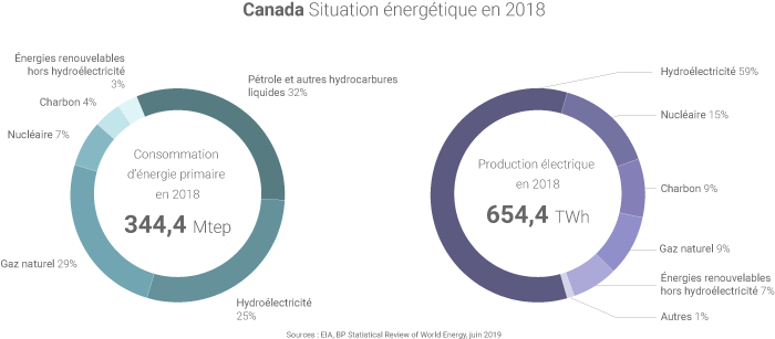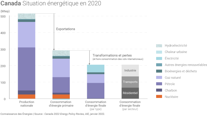 Le pays fait partie des dix principaux producteurs mondiaux de pétrole, de gaz naturel, d’hydroélectricité, d’uranium mais aussi d’électricité d’origine nucléaire ainsi que d’origine éolienne ou encore de biocarburants. Il extrait par ailleurs d'importantes quantités de minéraux « critiques » essentiels dans le cadre de la transition énergétique. Au total, le Canada a exporté 44% de sa production d’énergie en 2020, indique l’AIE.