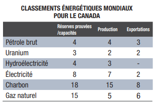 En 2014, le Canada était, au niveau mondial, le 2e producteur d’uranium naturel (derrière le Kazakhstan) et d’hydroélectricité (derrière la Chine), le 4e producteur de pétrole brut et le 5e producteur de gaz naturel, selon un autre rapport de l'Office national de l'énergie canadien publié en 2016(7). Le Canada disposait entre autres des 3e réserves prouvées de pétrole au monde (dont 97% se trouvent dans des sables bitumineux) et des 4e ressources identifiées d’uranium naturel.