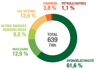 La production d'électricité du Canada s'est élevée à 639 TWh en 2022, reposant à 61,6% sur la seule filière hydroélectrique.