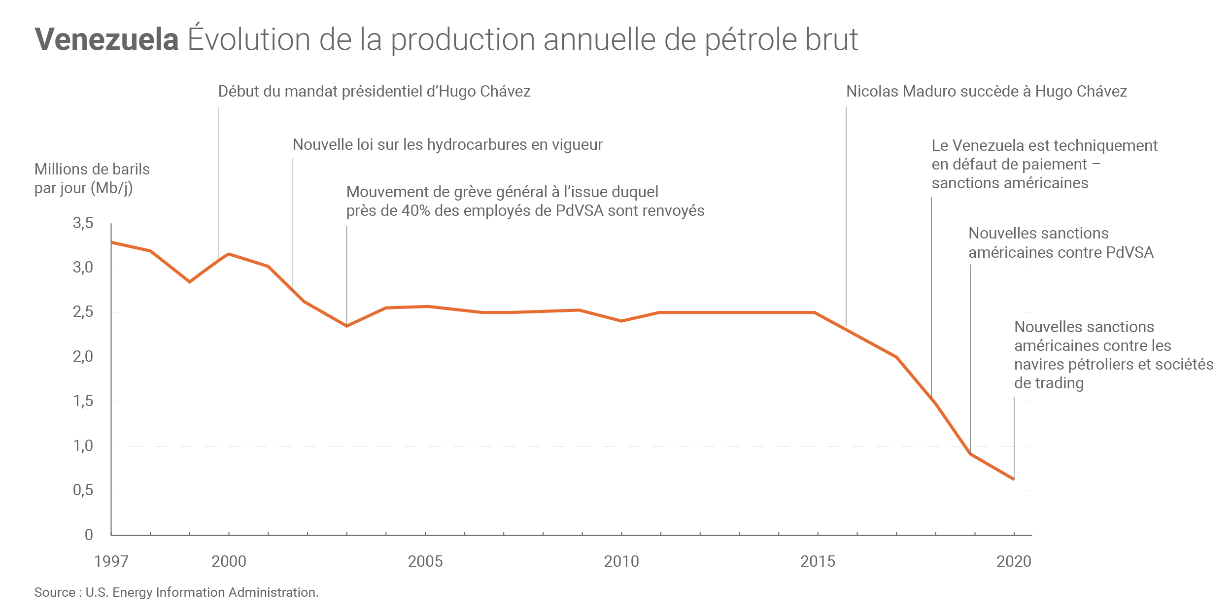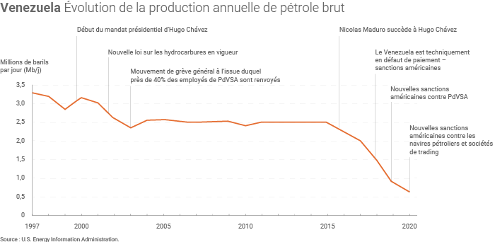 En août 2020, la production vénézuélienne de pétrole brut(3) a chuté à près de 360 000 barils par jour, « le plus bas niveau depuis que l'EIA suit cette production » (en 1973). Cette chute est notamment liée aux sanctions américaines successives mises en œuvre depuis 2017 mais aussi au manque de maintenance des installations pétrolières ainsi qu'à l'état financier de la compagnie publique PDVSA.