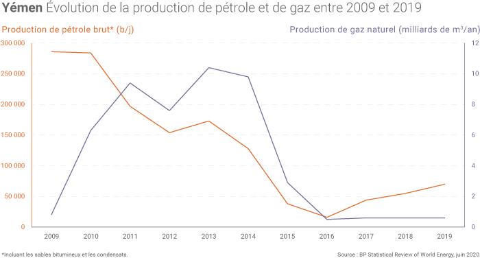 Après avoir chuté à 18 000 barils par jour en 2016, la production yéménite de pétrole brut est légèrement remontée à hauteur de 70 000 b/j en 2019, un niveau de production très faible encore, notamment en comparaison avec celui atteint au début des années 2010 (284 000 b/j en 2010)(1). La production yéménite de gaz naturel reste quant à elle quasi nulle.