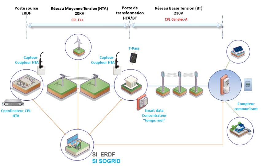 La transmission d’informations se fait par courant porteur en ligne (CPL) via les câbles électriques. Cette « chaîne de communication » connectée doit permettre de réaliser en temps réel des opérations à distance, par exemple repérer des pannes chez les clients et y remédier sans déplacement de technicien.