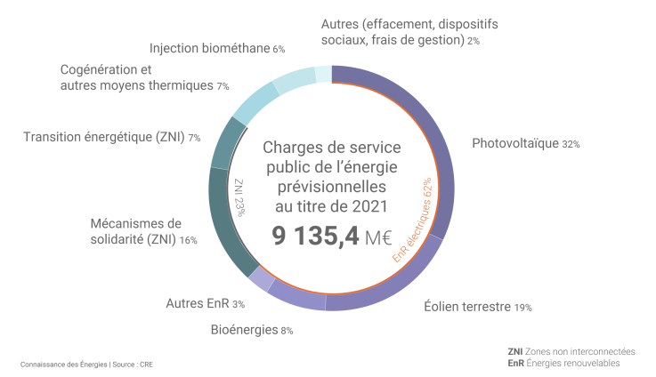 En 2021, ces charges pourraient s’élever à 9,135 milliards d’euros selon les prévisions de la CRE, dont 62% seraient consacrées au soutien de la production renouvelable d'électricité en France métropolitaine, 23% aux missions de service public dans les ZNI, 7% au soutien de la cogénération ou encore 6% à l'injection de biométhane dans les réseaux gaziers.