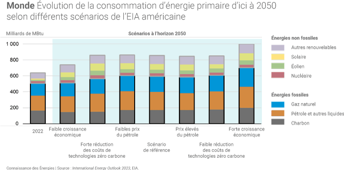 Et selon l'EIA, la consommation mondiale d'énergie primaire est amenée à fortement augmenter d'ici à 2050, que ce soit dans son scénario de référence (+ 34% par rapport à 2022) comme dans les autres trajectoires étudiées par l'Agence (forte ou faible croissance économique, prix bas ou élevés du pétrole, etc.).