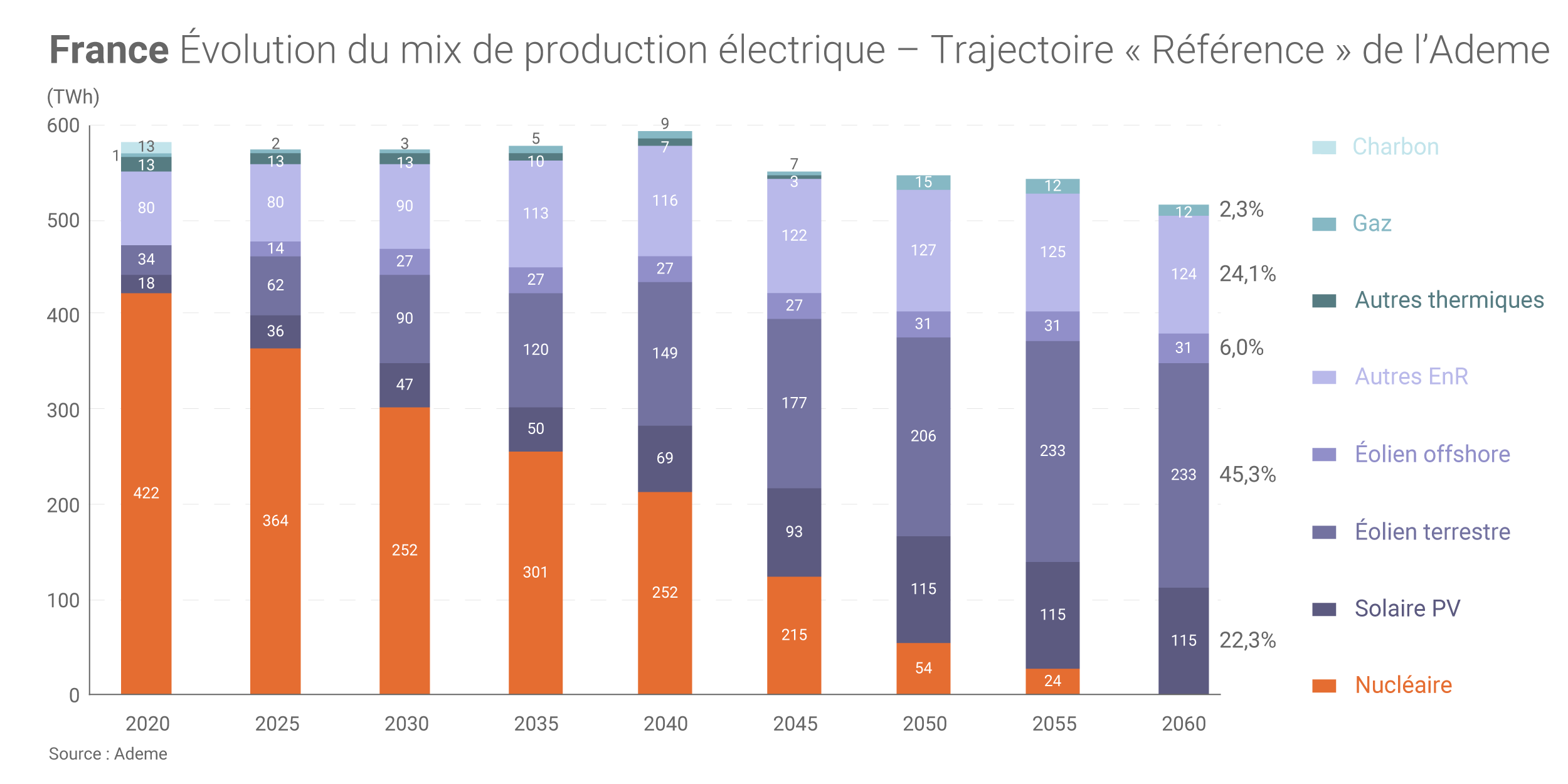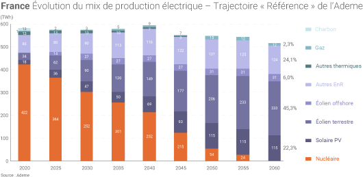 Dans la trajectoire dite « Référence » de l’Ademe, les énergies renouvelables compteraient pour près de 87% de la production électrique française en 2050. (©Connaissance des Énergies, d’après Ademe).