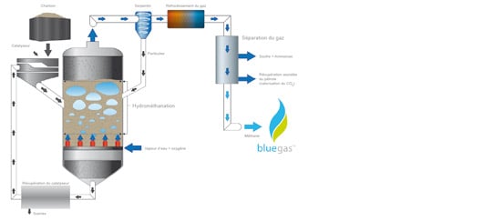 Le catalyseur utilisé par Great Point Energy est récupéré et réutilisé dans le gazéifieur où il permet de réduire la température globale exigée par les réactions chimiques de méthanation. Les coûts des installations peuvent ainsi être abaissés par l’emploi de matériaux moins réfractaires. Le procédé « bluegas » prévoit également une unité de récupération des impuretés et du CO2 qui peut être valorisée ultérieurement, notamment pour la récupération assistée du pétrole.