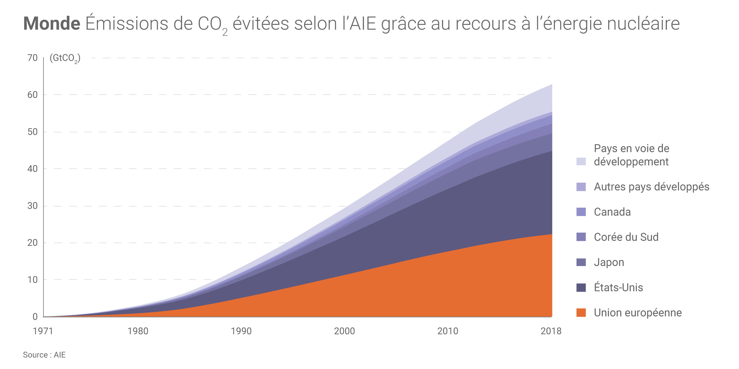 Dans son rapport, l’AIE estime que le recours à l’énergie nucléaire lors des dernières décennies a permis d'éviter l’émission supplémentaire de 63 milliards de tonnes de CO2 entre 1971 et 2018. « Sans nucléaire, les émissions liées à l’électricité aurait été supérieures de près de 20% durant cette période et le total des émissions liées à l'énergie de 6% », estime l’AIE.